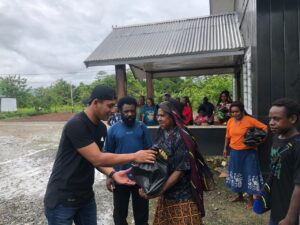 sementara bantuan untuk Pemuda Karang Mulia Distrik Nabire Kab. Nabire, diserahkan kepada Otto Nawipa (Mahasiswa Unswim Kalibobo Nabire) dan Pemuda RT.10 Kp. Kimi Distrik Teluk Kimi Kab. Nabire, diterima. Opan Marey (Kepala Kampung Kimi Distrik Teluk Kimi, serta Pemuda RT.04 Kp. Kimi Distrik Teluk Kimi Kab. Nabire diterimakan kepada Pendeta Yeri Murib selaku Kepala Dusun Kp. Kimi