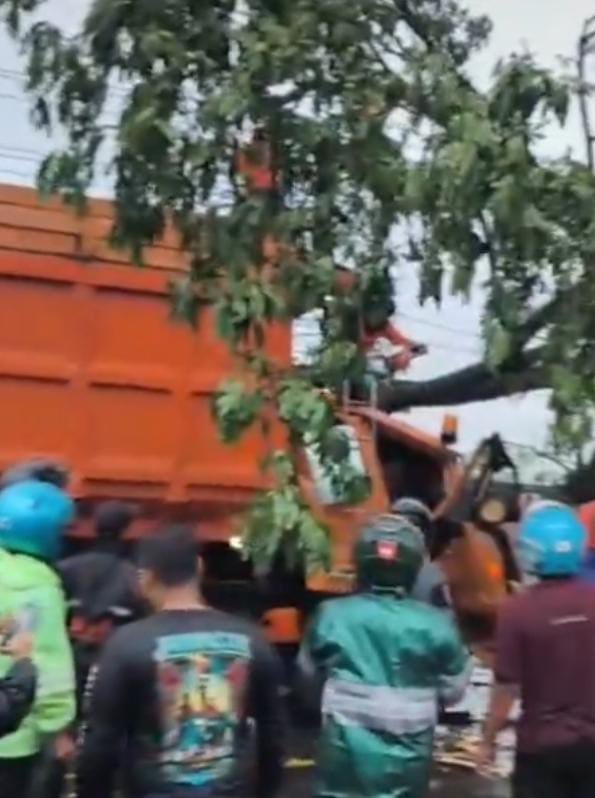 TRUK TERTIMPA POHON TUMBANG, JALUR PANTURA KUDUS MACET TOTAL